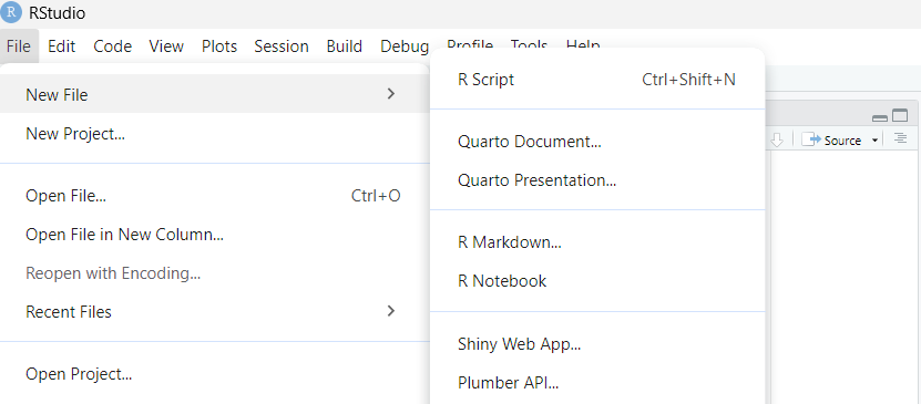 Norint sukurti naują failą galima naudojantis viršuje esančia meniu juosta. Pavyzdžiui, taip sukuriamas naujas .R failas: File > New file > R Script. Paprastesnis būdas - naudoti klavišų kombinaciją Ctrl + Shift + N.