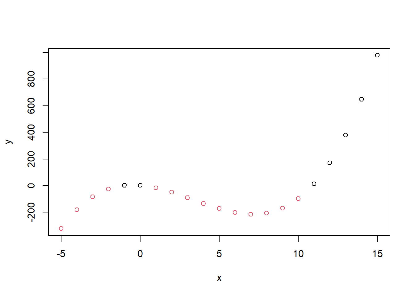 Pavyzdžiui, parametrui pch suteiksime dvi reikšmes, kurios cikliškai bus pakartojamos. Taškai su nelyginiu indeksu įgys reikšmę pch = 1, o lyginiai indeksai - pch = 2.
