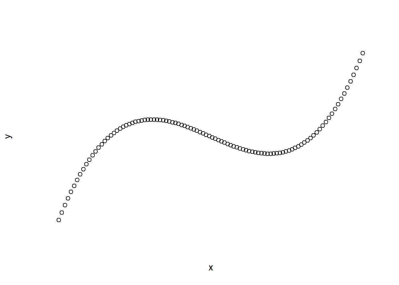 Nubraižykite taškų \((x, y)\) sklaidos diagramą, kurioje būtų atvaizduoti tik patys taškai, bet nebūtų nei ašių, nei ašių pavadinimų, nei kitų antraščių.