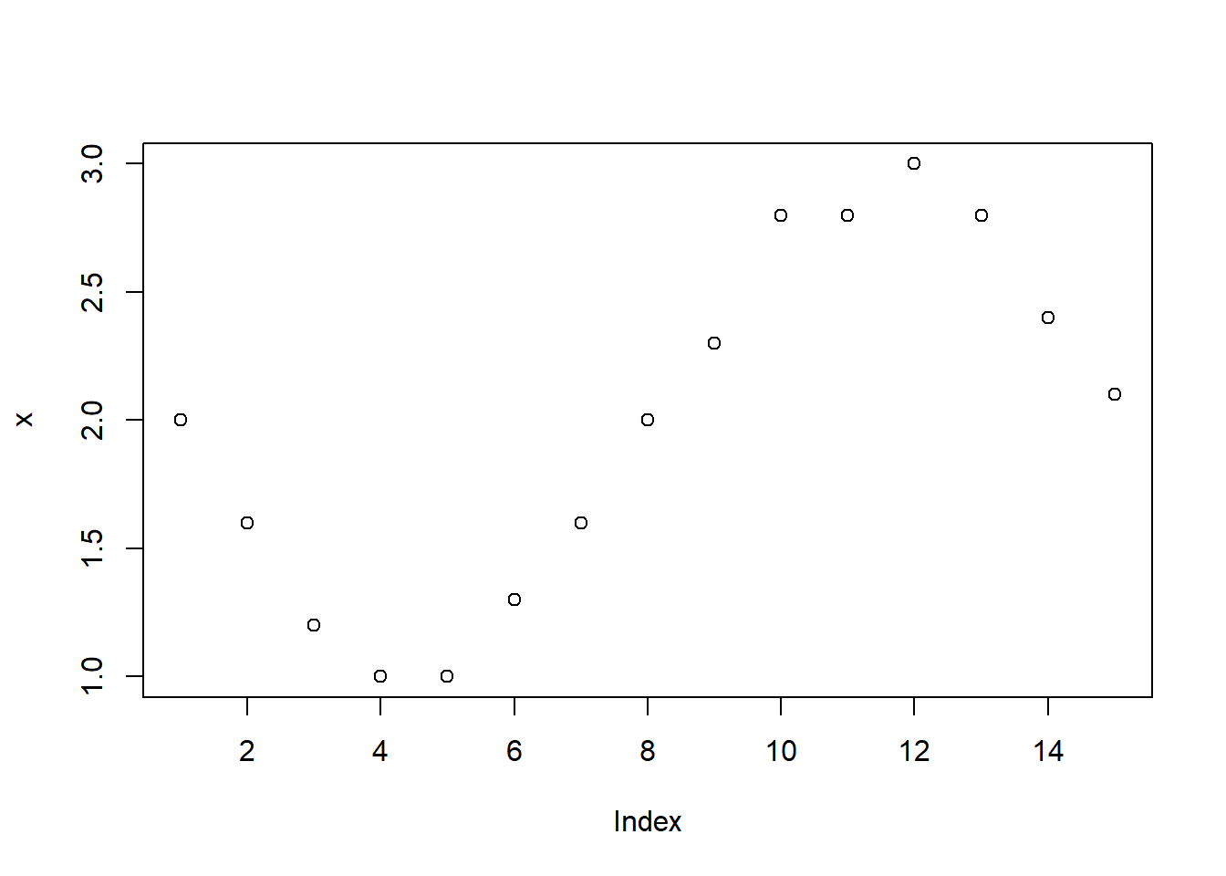 x <- c(2.0, 1.6, 1.2, 1.0, 1.0, 1.3, 1.6, 2.0, 2.3, 2.8, 2.8, 3.0, 2.8, 2.4, 2.1)