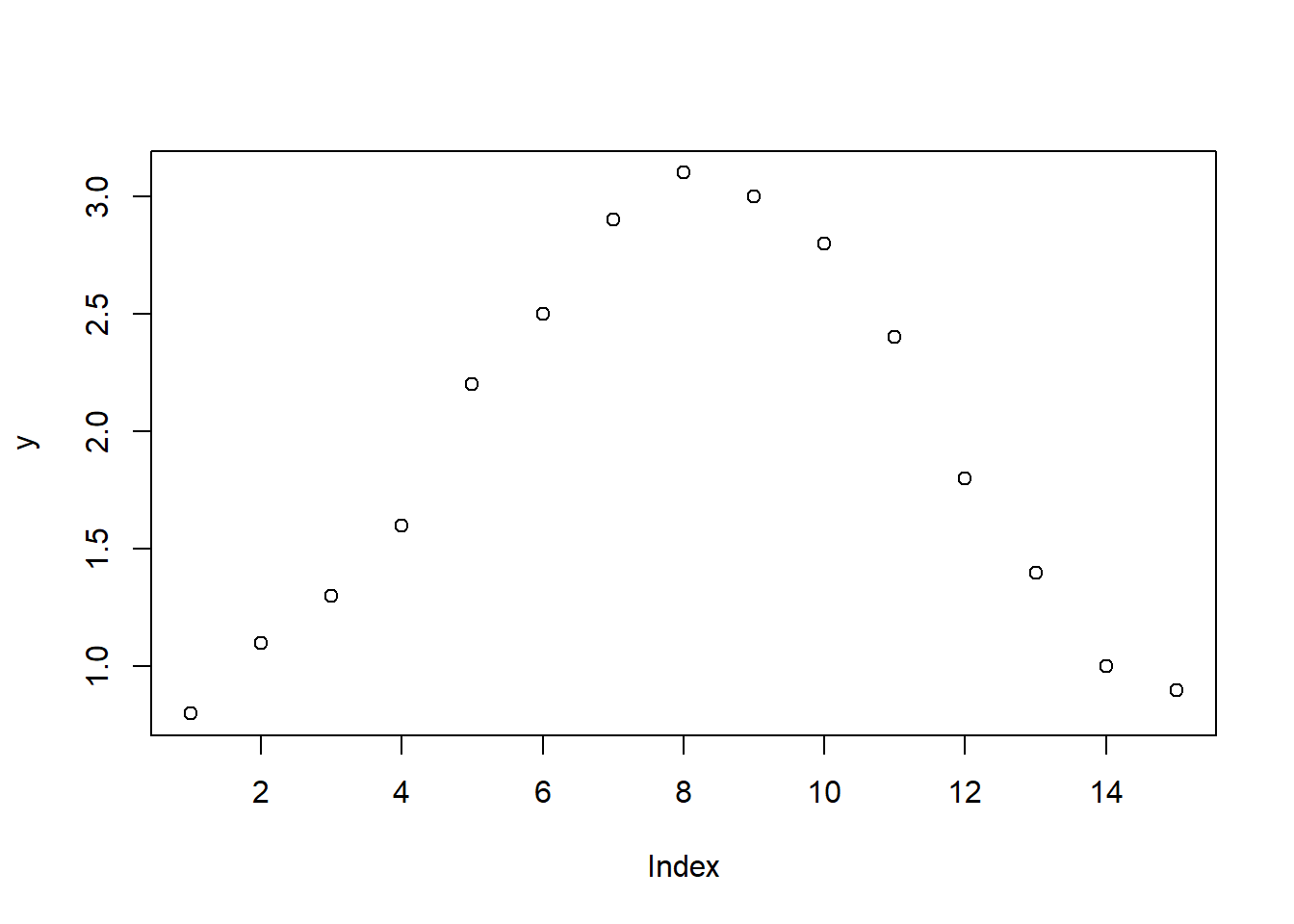 y <- c(0.8, 1.1, 1.3, 1.6, 2.2, 2.5, 2.9, 3.1, 3.0, 2.8, 2.4, 1.8, 1.4, 1.0, 0.9)