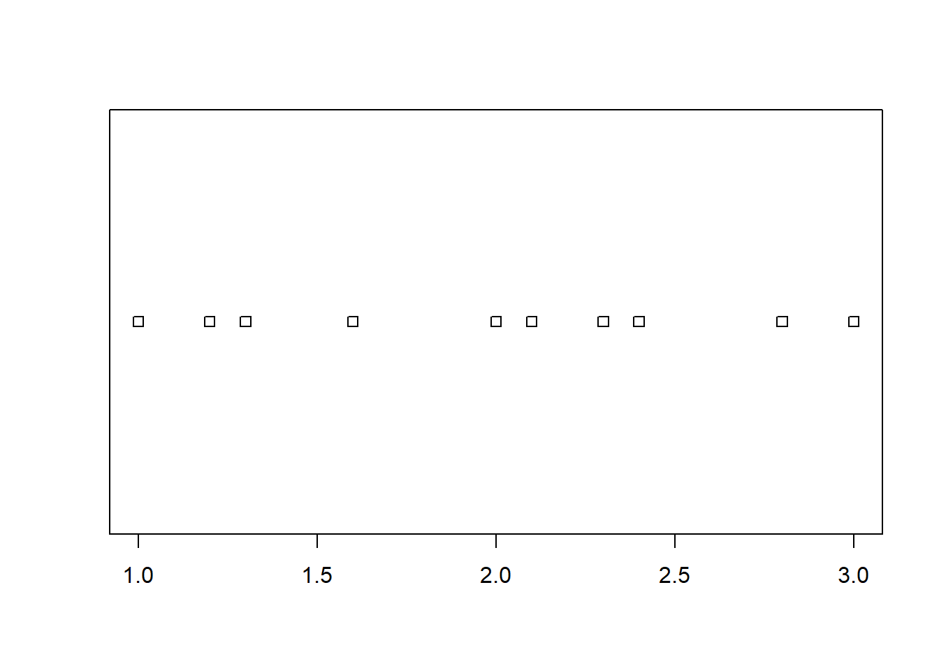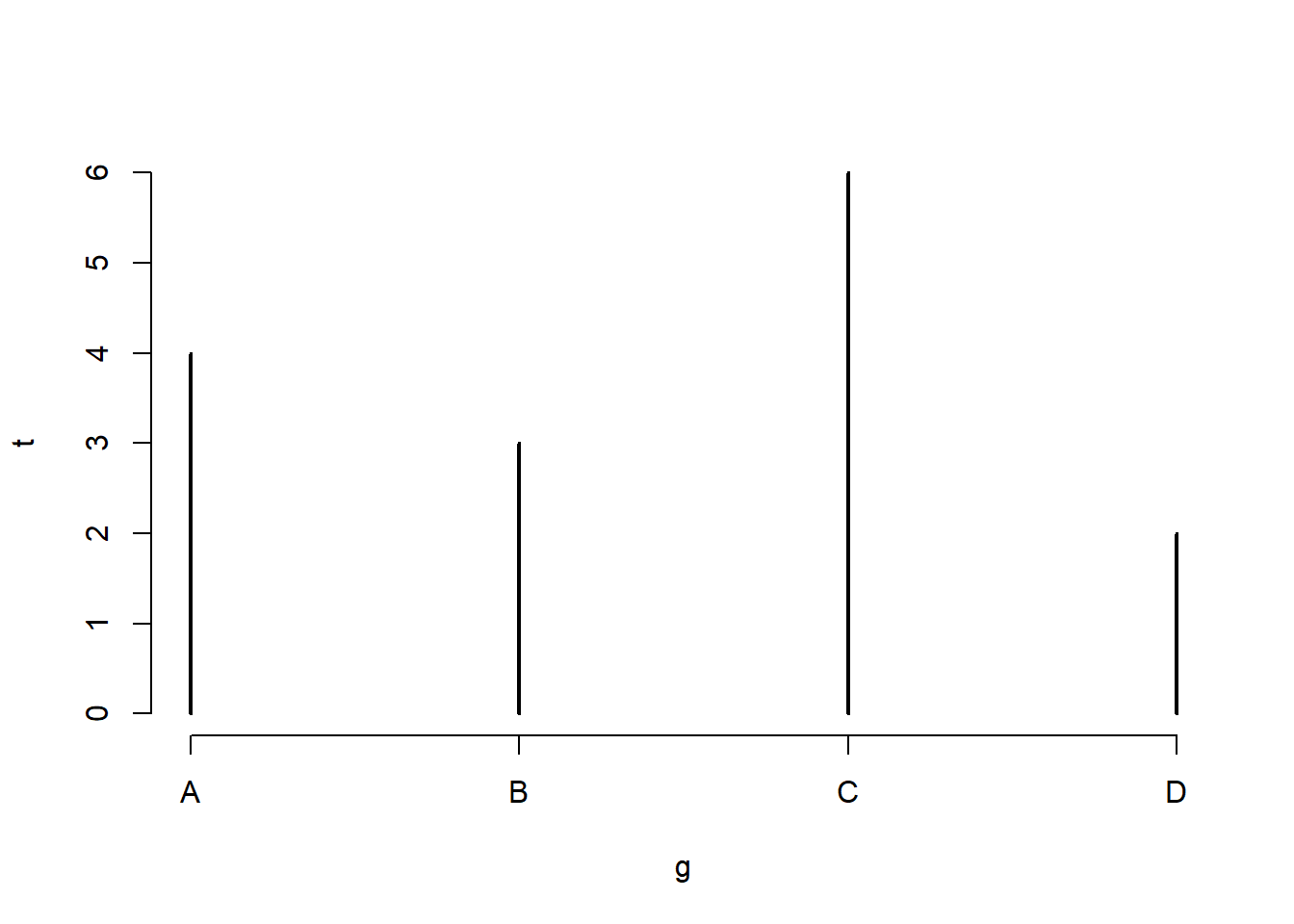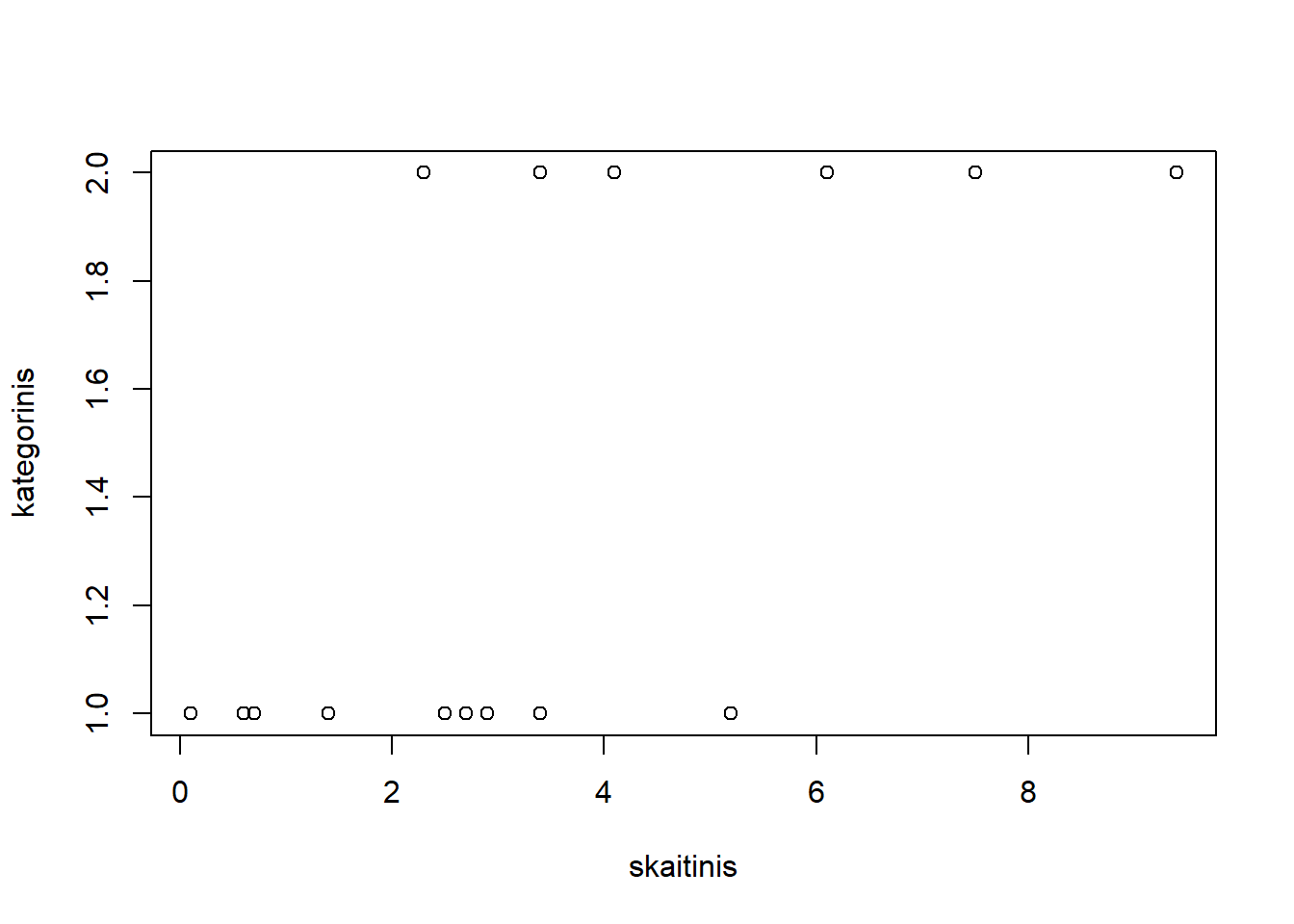 Jeigu funkcijos plot() parametrui x priskiriamas skaitinis vektorius, o parametrui y – kategorinis (faktorius), tai skirtingoms grupėms priklausančios skaitinio kintamajo reikšmės išdėstomos ant tas grupes atitinkančių horizontalių tiesių.