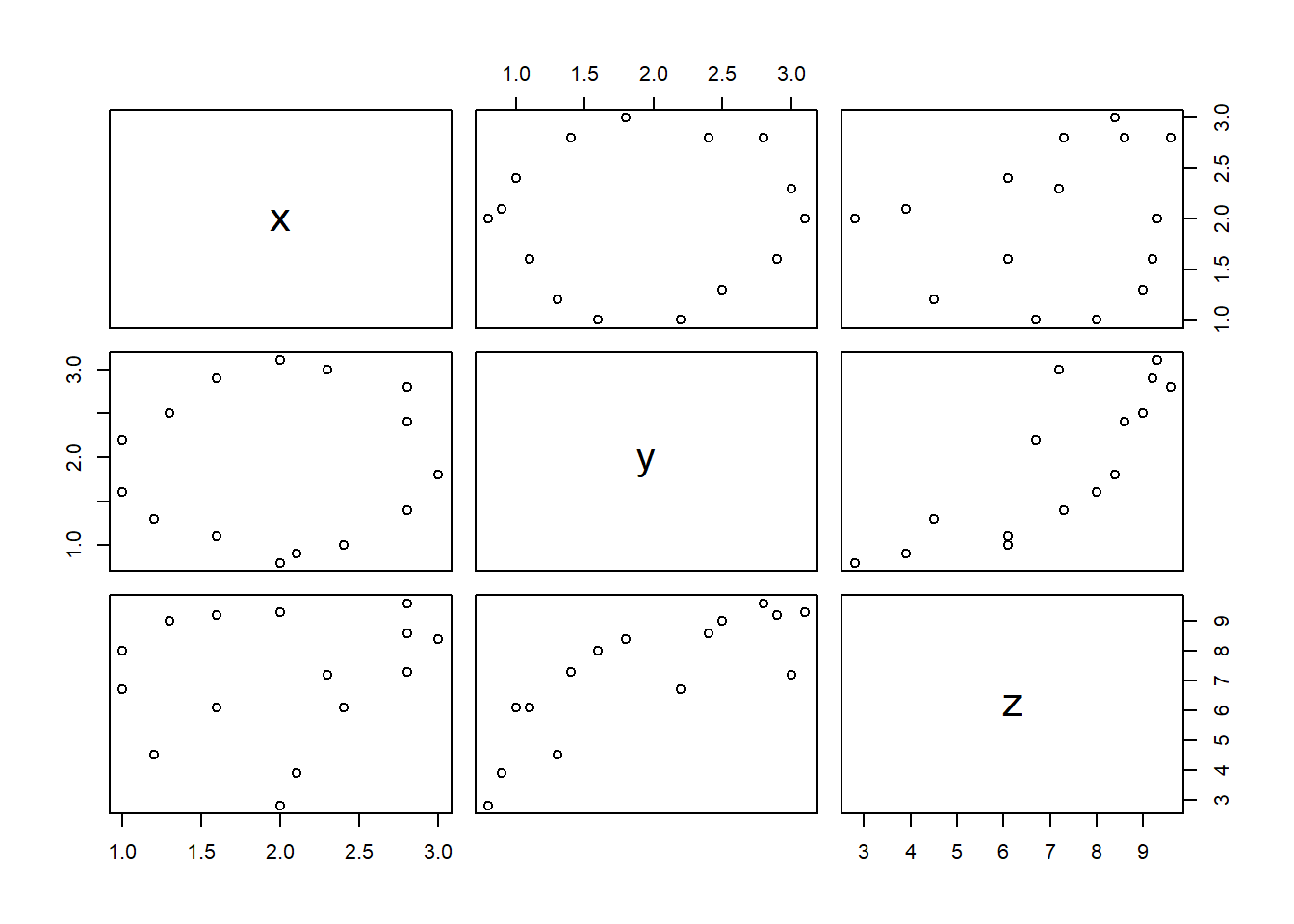 y ~ x – taškų su koordinatėmis \((x, y)\) sklaidos diagrama,y ~ 1 – taškų \((i, y_i)\) diagrama, kai \(i\) – \(y\) elementų eilės numeris,~ x – taškų su koordinatėmis \((x, 1)\) išsidėstymo tiesėje diagrama,~ x + y – ta pati taškų \((x, y)\) sklaidos diagrama,~ x + y + z – trijų kintamųjų \(x\), \(y\) ir \(z\) porų sklaidos diagramos.Naudodami duomenų lentelės d kintamuosius, pagal šiuos modelius nubraižysime visas šias sklaidos diagramas.
