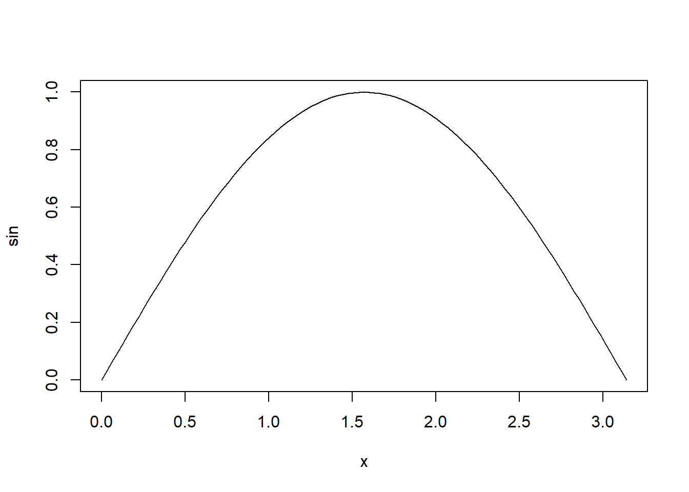 R turi daug praktikoje reikalingų ir dažnai taikomų funkcijų, kurių atskirai užrašyti nereikia – pakanka žinoti jų pavadinimus. Pavyzdžiui, atvaizduosime funkcijos \(y = \sin x\) grafiką intervale \([0, \pi]\).