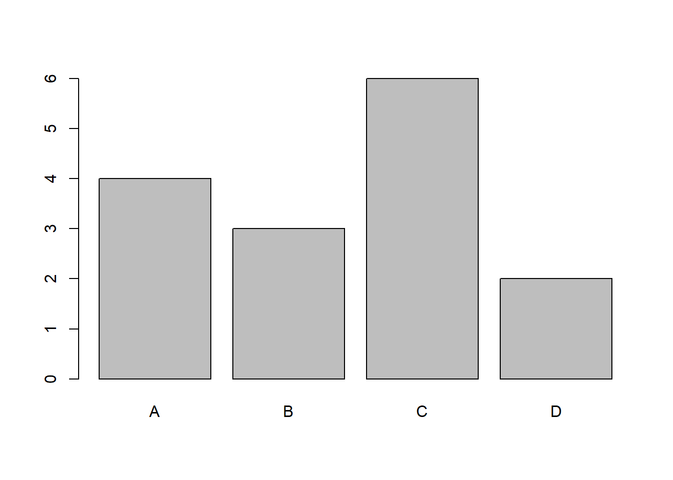 Stulpelinį, reikšmių dažnių grafiką galima gauti ir greičiau, praleidžiant dažnių lentelės kūrimą. Užtenka raidžių reikšmių vektorių g paversti faktoriumi ir perduoti jį tiesiogiai funkcijai plot().
