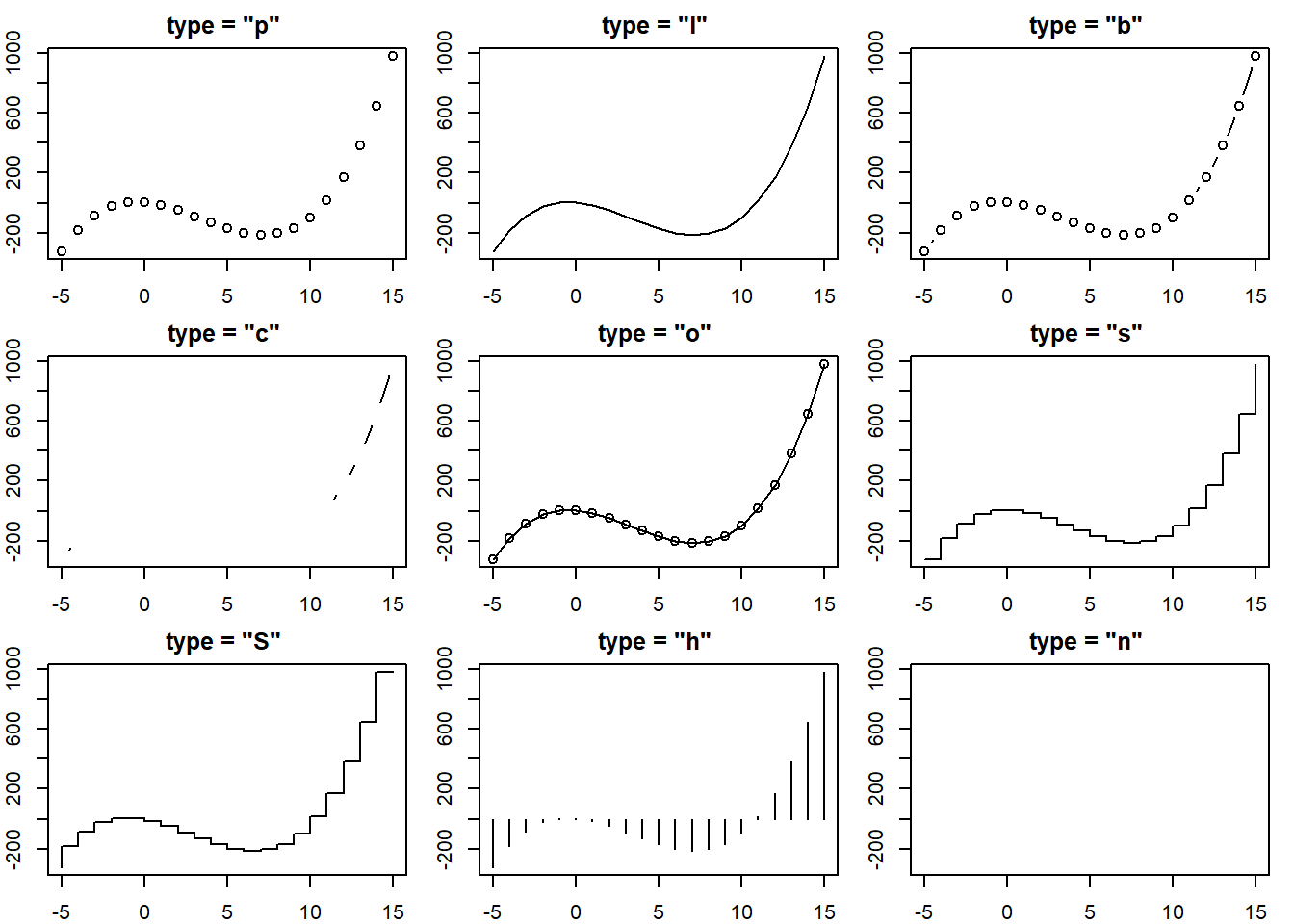 Peržiūrėsime, kaip keičiant parametro type reikšmę, gaunami skirtingi sklaidos diagramos variantai, kurie skiriasi taškų (\(x\), \(y\)) atvaizdavimo ir jų sujungimo būdais: