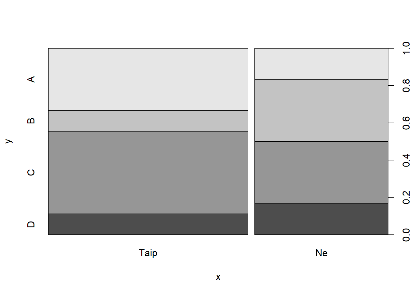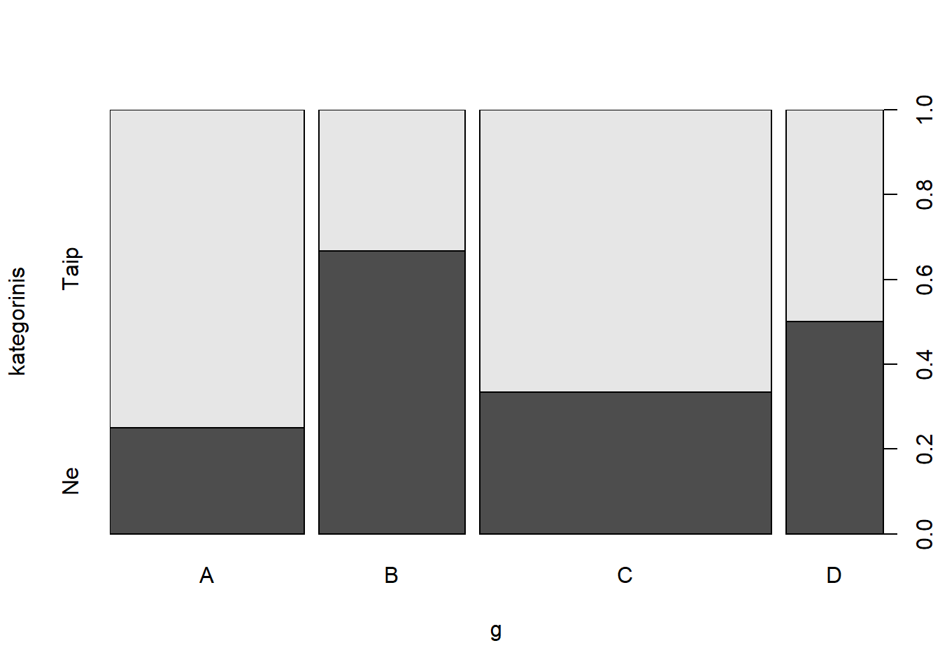 Jei iš karto abiems parametrams x ir y priskiriami kategoriniai kintamieji, nubraižoma speficinė stulpelinė diagrama, kuri vadinama spineplot. Joje ant \(Ox\) ašies išdėstomi skirtingas x kintamąjo kategorijas atitinkantys vienetinio aukščio stulpeliai. Kiekvienas stulpelis padalinamas į tiek dalių, kiek skirtingų y reikšmių yra toje stulpelio grupėje, o dalies dydis proporcingas tų reikšmių dažniui.