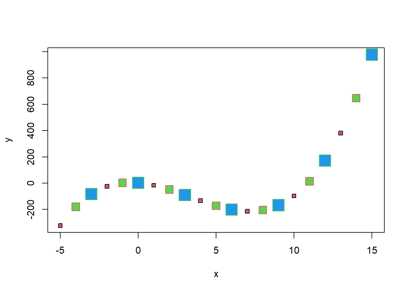 plot(x, y, pch = 22, cex = 1:3, col = 1:3, bg = 2:4)